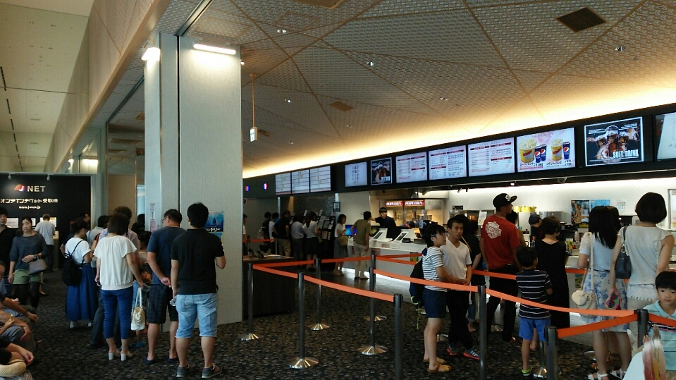 映画館は、開演時間が近づくとチケットと求める人、フードを求める人で長蛇の列で